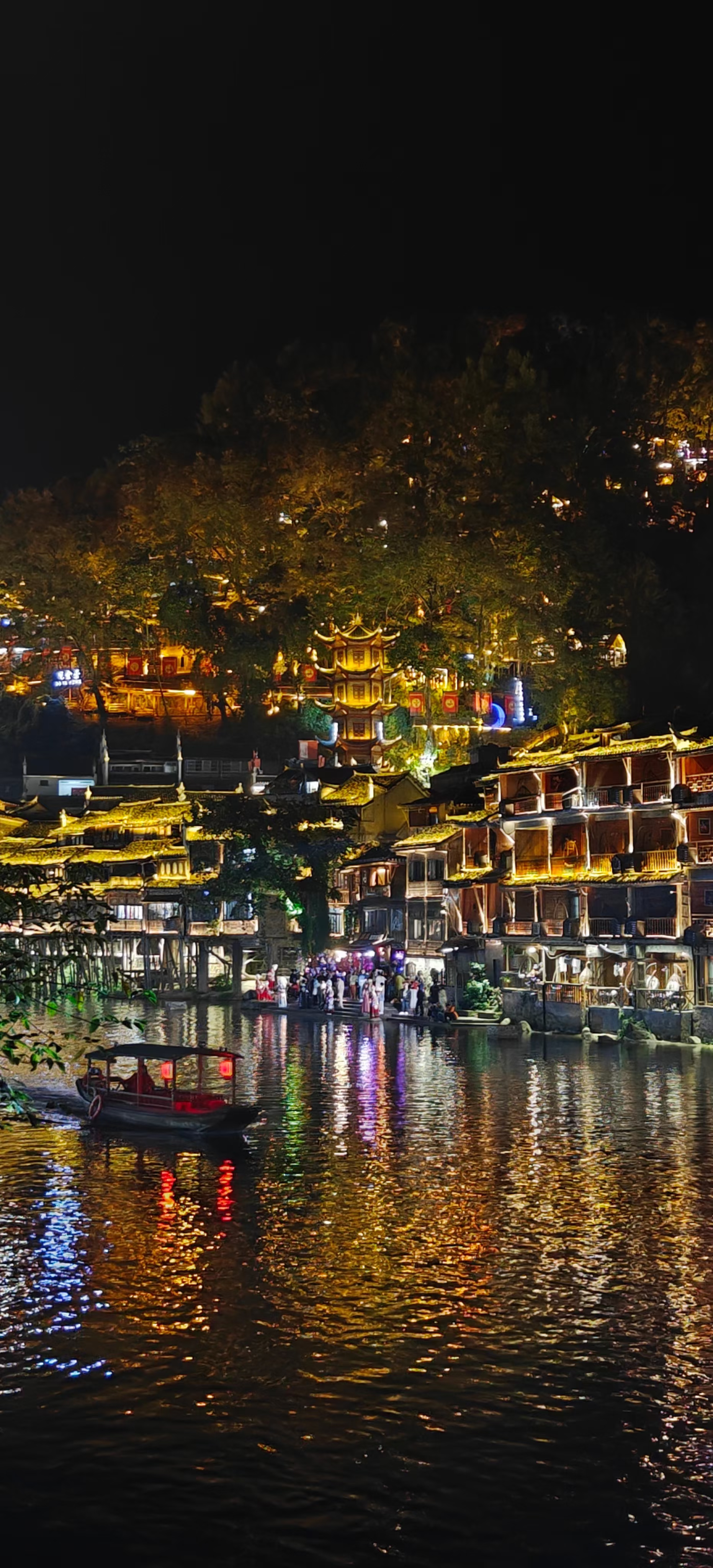 夜晚的鳳凰古城,千燈萬火,光影籠罩,與天上星月相輝映,沱江兩岸璀璨逶迤數(shù)里,紅色城墻、灰色古建筑、吊腳樓、古橋、流水、古街深巷、燈火、穿著苗族服飾拍照的姑娘等,猶如一幅幅畫卷,展示著古城的美麗。在臨街而駐的店鋪,曲徑通幽的長街深巷,到處是摩肩接踵的人群,大家沉浸在光采絢麗的夜景中,流連忘返。