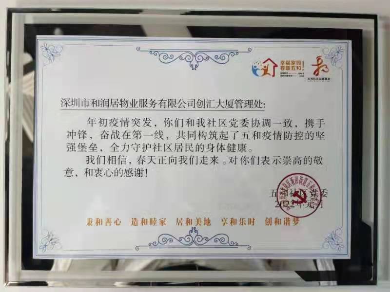 2022年1月26日,深圳市和潤居物業(yè)服務有限公司創(chuàng)匯大廈管理處和創(chuàng)興時代管理處,分別收到坂田街道及五和社區(qū)黨委發(fā)來的表揚性和感謝信。