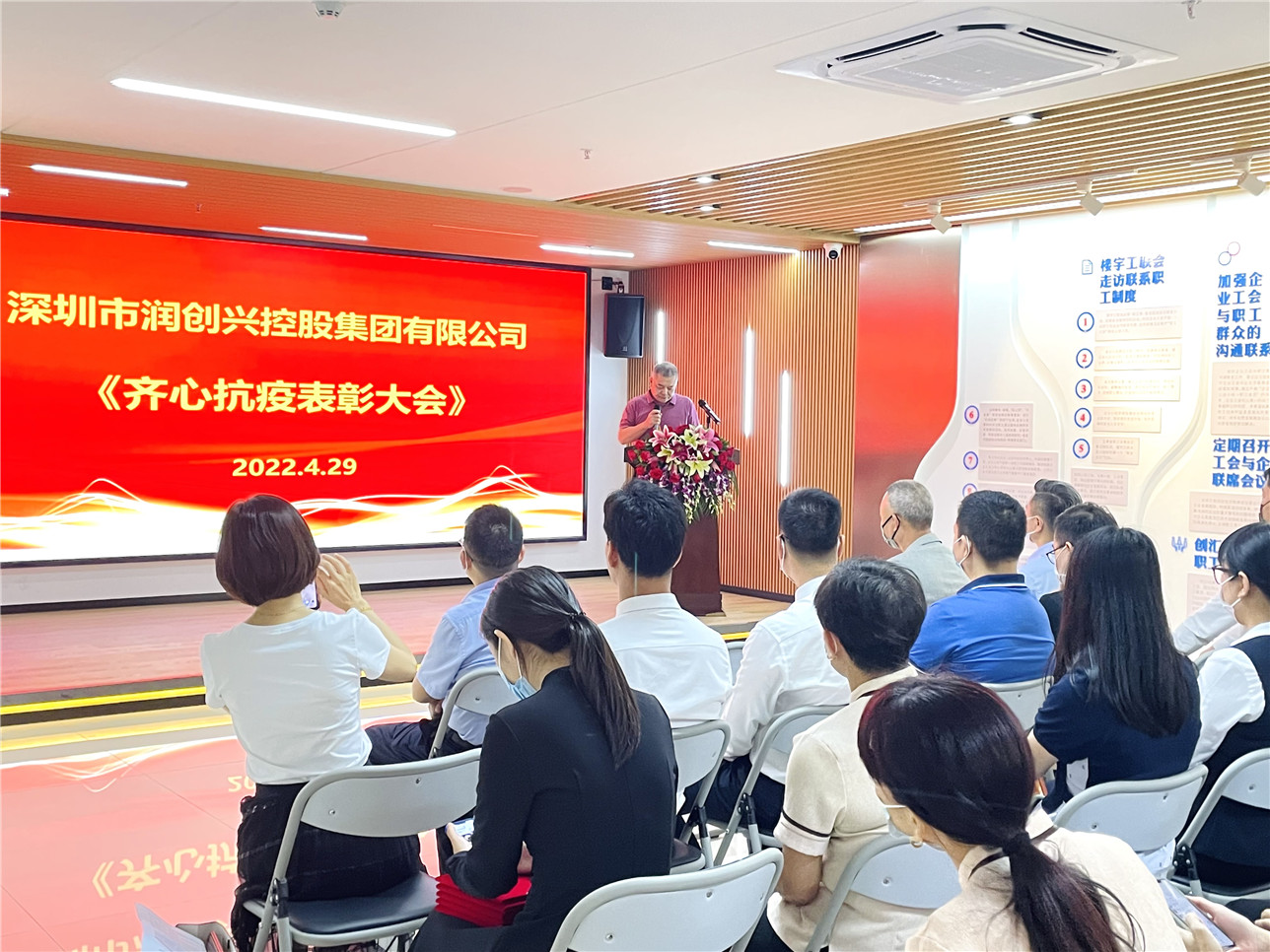 2022年4月29日下午15點(diǎn),在創(chuàng)匯國際中心21樓舉行“深圳市潤創(chuàng)興控股集團(tuán)有限公司齊心抗疫表彰大會(huì)“。潤創(chuàng)興集團(tuán)公司董事長黃亞水、總經(jīng)理吳椰軍、副總經(jīng)理張海波、副總經(jīng)理羅勇、總助黃輝及集團(tuán)總部和下屬公司員工參加了本次表彰大會(huì)。
